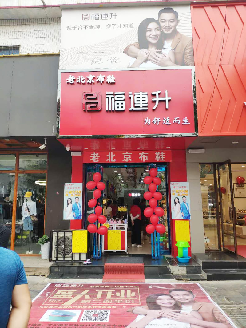在此,福连升健康休闲中年鞋(原福连升(原福联升)老北京布鞋)全体员工祝贺:福连升中年鞋河南尉氏文化路二店开业大吉、生意红火、财源广进!诚邀各地有志之士加盟合作,共享辉煌!